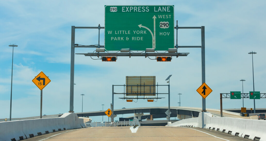 HOV stands for High Occupancy Vehicle. HOT stands for High Occupancy Toll. Both refer to a barrier-separated lane in the middle of I-45, Hwy. 59 and Hwy. 290. The lane runs in one direction, but it’s reversible depending on time of day. In the mornings, vehicles travel toward downtown Houston. In the afternoons, they travel away from downtown. Lane usage, and whether or not a toll is required, depends on the freeway you’re using, time of day and total number of people in your vehicle.